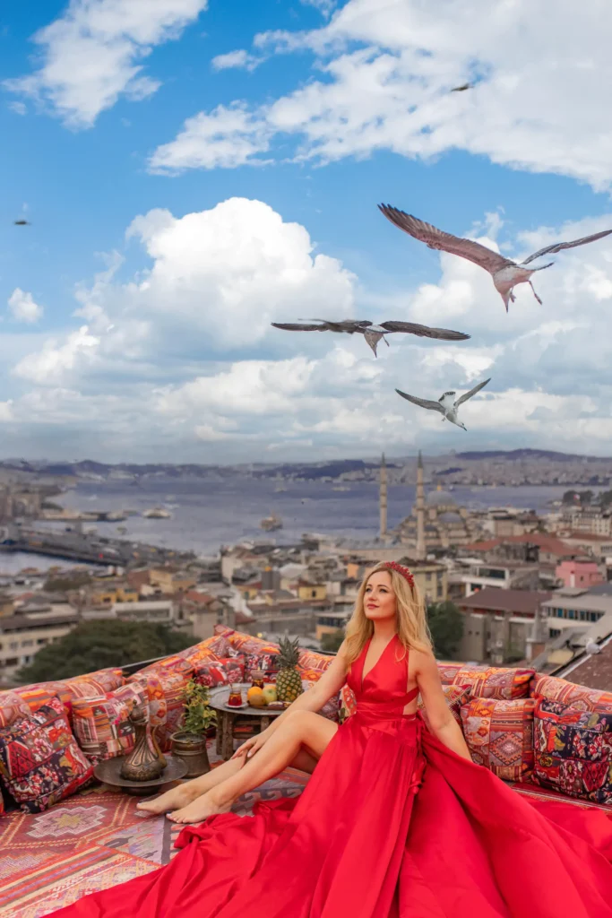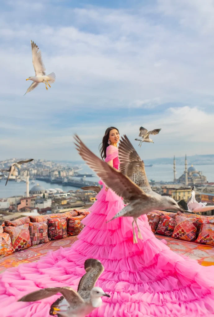 The Panoramic Rooftop: Perfect for those “flying dress” shots with the Bosphorus and Hagia Sophia in the background.