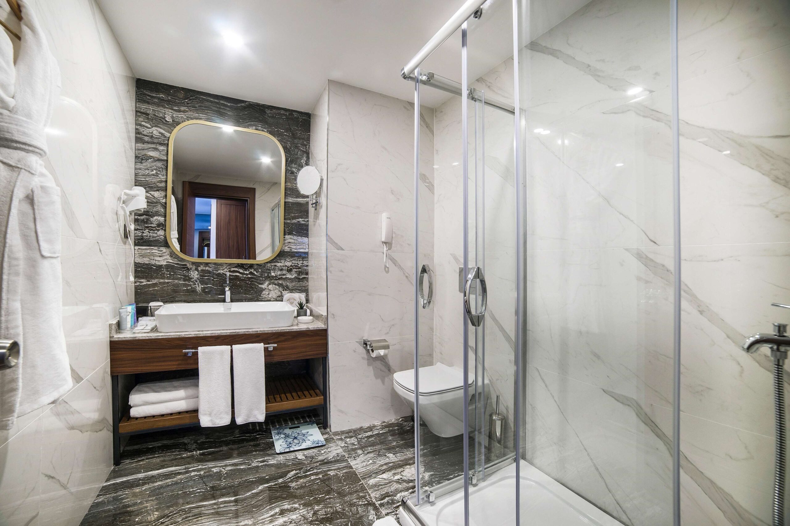 Design: The rooms feature high ceilings, plush velvet textures, and marble bathrooms equipped with hydromassage showerheads and premium designer toiletries.